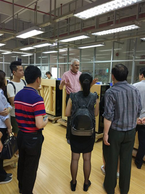 下午,經銷商直奔增城國家文化產業示范基地。在增城廠區,他們參觀了6層樓高占地約20畝的鋼琴生產大樓。威騰鋼琴董事長馮漢輝全程陪同,并逐層介紹,先后參觀了外殼組件車間、共鳴盤生產流水線、鋼琴總裝流水線、 擊弦機生產車間、凱撒堡KA廠等,了解各區域功能布局,觀察工人的生產操作過程。經銷商們饒有興趣地詢問有關生產流程及部件質量的監控情況等,零距離了解珠江鋼琴集團技術研發、質量保證等能力。